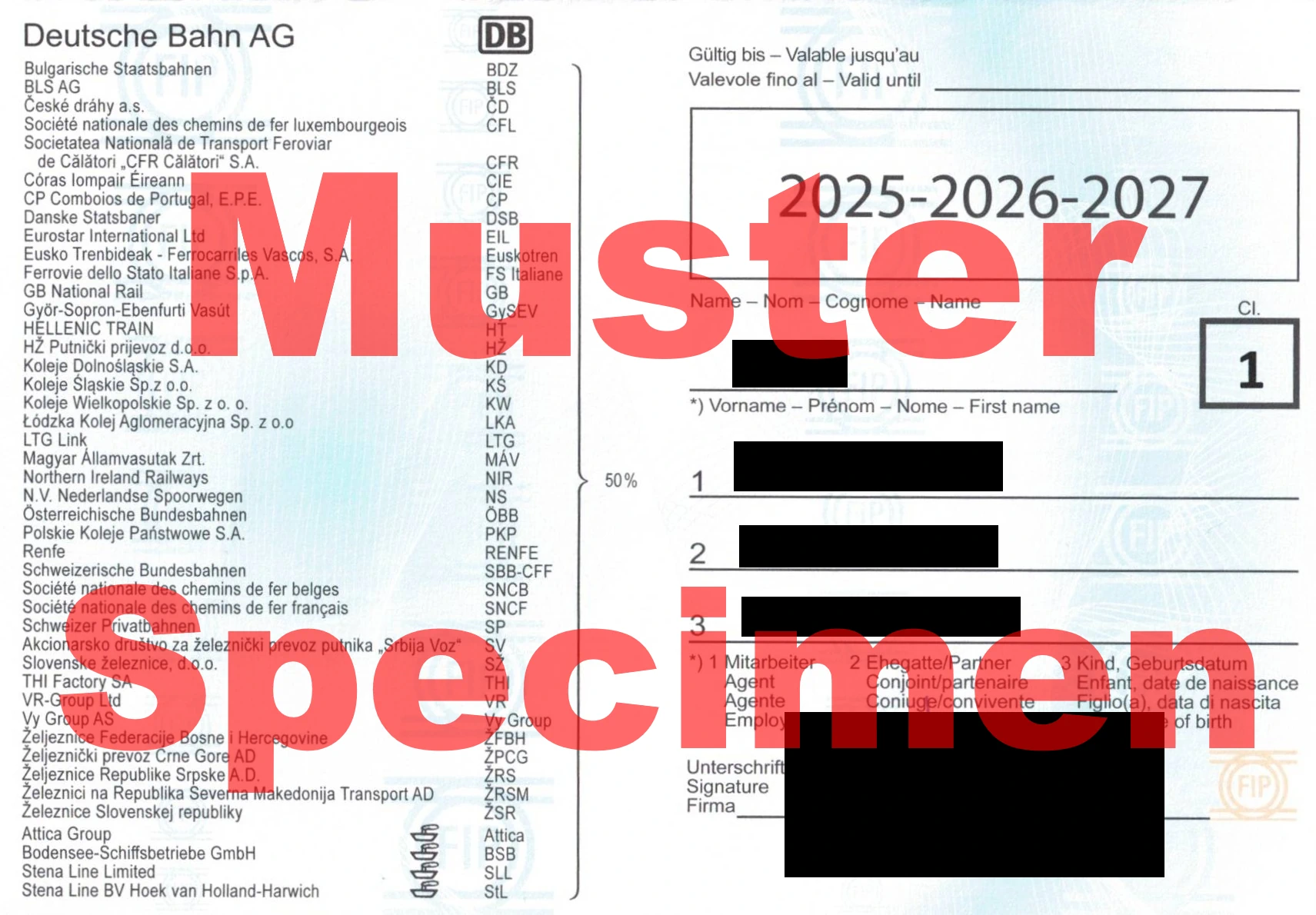 To use FIP discounts, you need a valid International Discount Card for Railway Staff, commonly referred to as the FIP Card. The FIP Card is always valid for a fixed period of three years. The current period is 2025-2026-2027. The FIP Card is required as proof of entitlement for FIP 50 Tickets. It is issued either for 1st or 2nd class. With a 1st class card, you can purchase FIP Coupons and FIP 50 Tickets for both 1st and 2nd class; with a 2nd class card, only for 2nd class. The card can be ordered through your respective railway company. The exact ordering process varies by company.