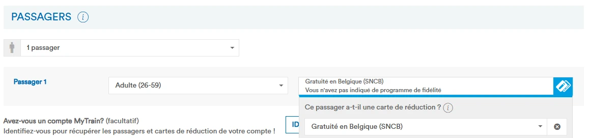 Lors de l’utilisation d’un Coupon FIP pour la SNCB, la CFL ou la NS, il est possible de réserver un billet transfrontalier sur le site web, qui prend en compte la gratuité sur le tronçon belge, luxembourgeois ou néerlandais. Pour cela, il faut sélectionner l’une des réductions suivantes pour les voyageurs :